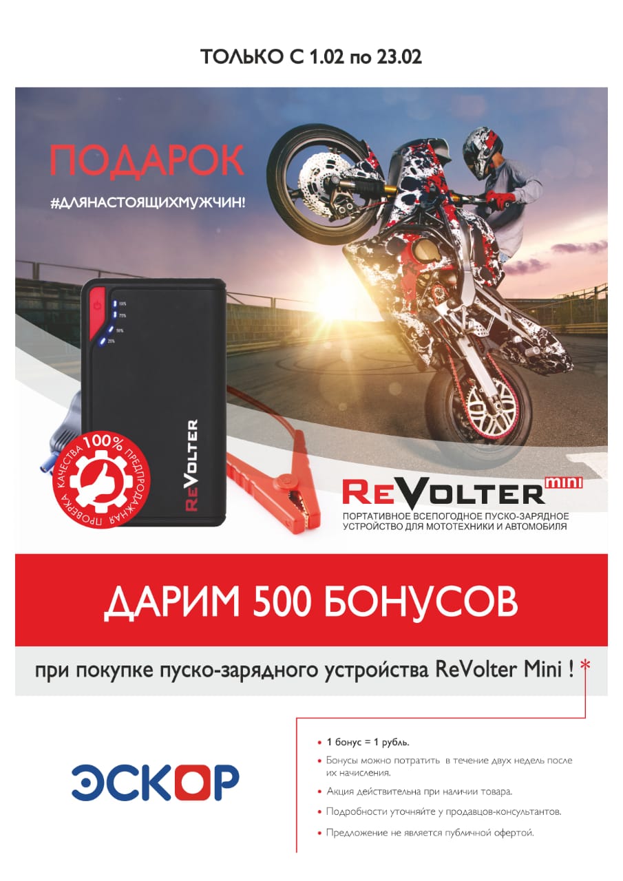 С 1 по 23 февраля при покупке пуско-зарядного устройства ReVolter Mini магазин Эскор дарит Вам 500 бонусов! Бонусы можно потратить в течение двух недель после их начисления.